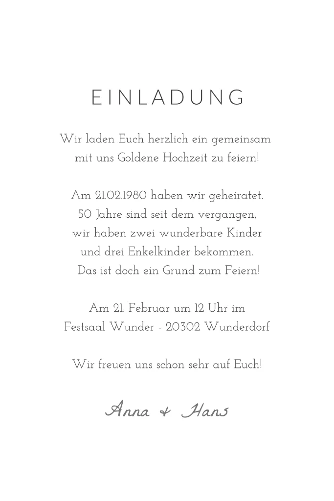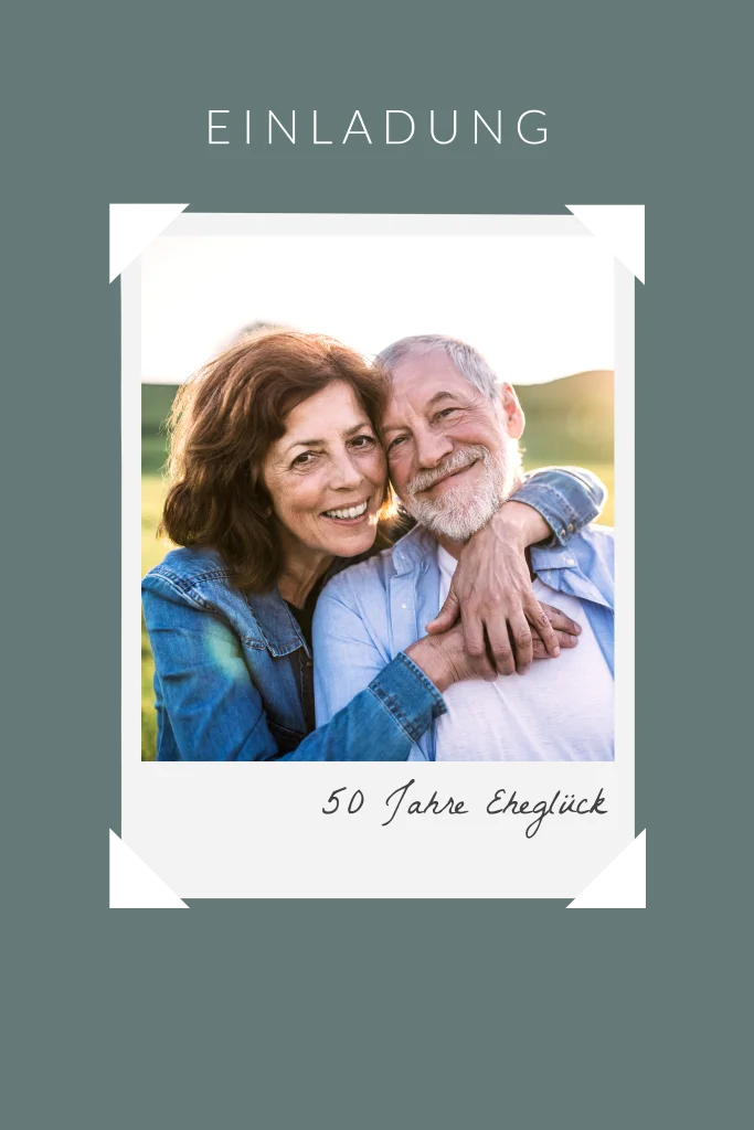 Den Mittelpunkt dieser Einladungskarte bildet ein Portraitfoto zu eurem Hochzeitsjubiläum in Form eines Polaroids mit Fotoecken aus Goldfolie. Feiert mit euren Liebsten eure Liebe, eure bezaubernden Kinder und Enkelkinder. Freut euch auf eine goldige Feier.