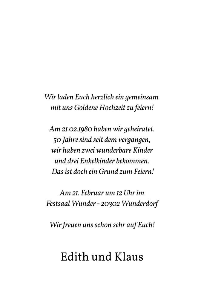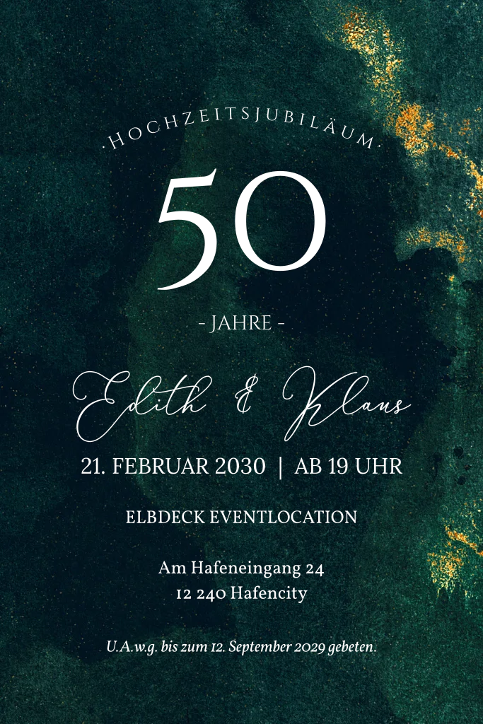 Grüner Marmor gepaart mit goldenen Anstrich-Applikationen eignen sich hervorragend als elegante Einladungskarte für eure Goldene Hochzeit. Verwendet für eure Texte unsere Goldfolie zur Veredelung und überrascht eure Gäste im Inneren mit einem schönen Foto.