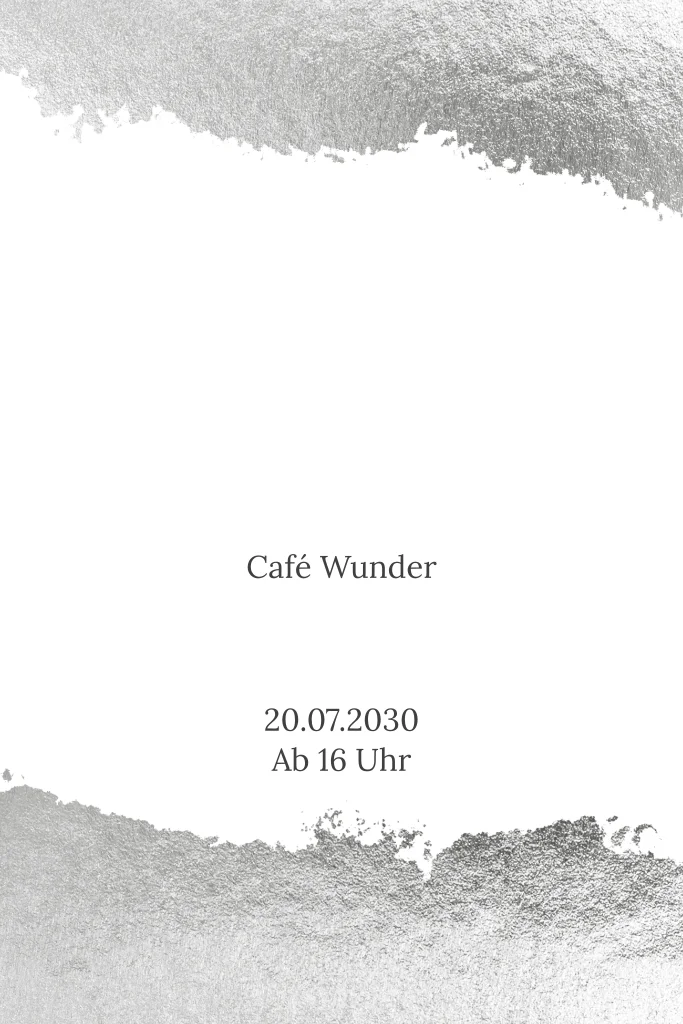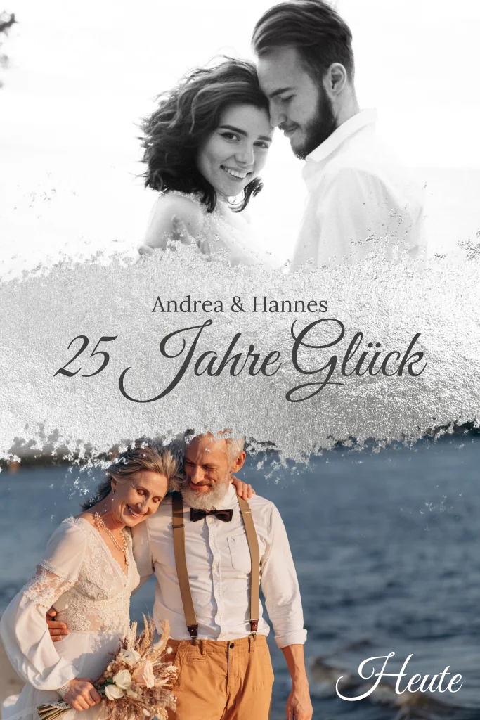 Unsere Silberrausch Jubiläumskarte besticht durch das Hochzeitsfoto von damals und ein Foto von heute im Vergleich. Verzaubere deine Gäste mit den Silbersprenkeln auf jeder Seite und die wichtigsten Informationen für eure Silberhochzeit. Freut euch auf ein glitzerndes Fest.