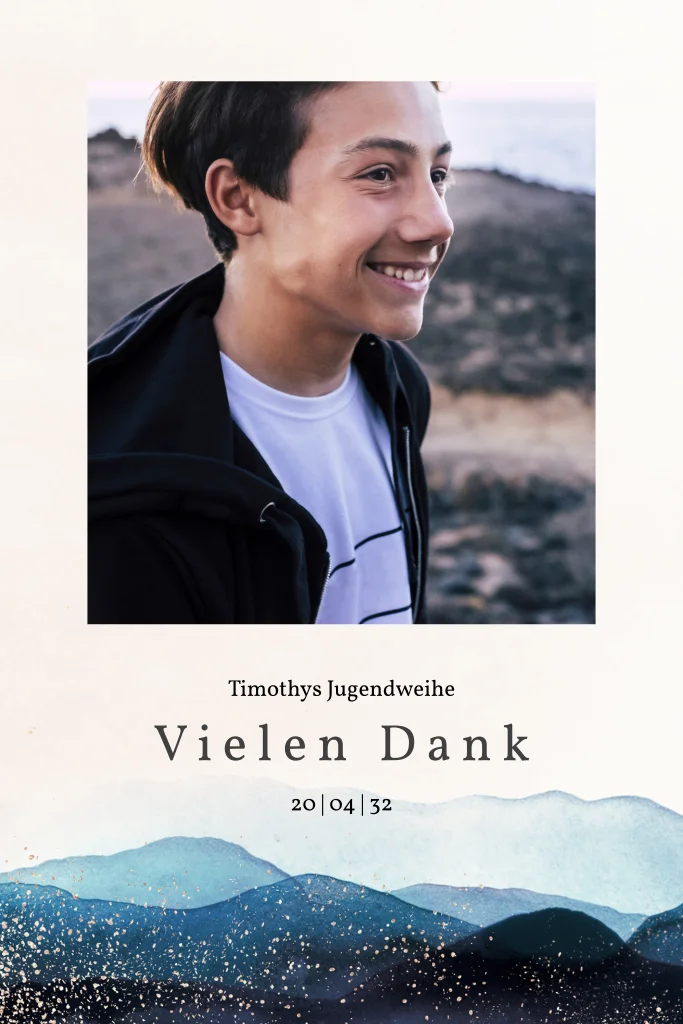 Tief verwurzelt wie ein Anker im seichten Meer bleibst du standhaft, auch wenn die nächste Welle kommt. Kündige mit diesem Wellenaquarell und deinem Lieblingsfoto an, dass deine Jugendweihe in den Startlöchern steht. Freue dich auf deinen großen Tag.