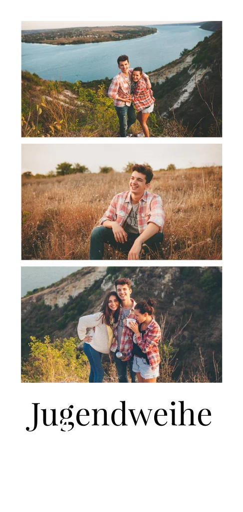 Kinderjahre vergehen im Nu und schon sind sie groß und die Jugendweihe steht vor der Tür. Gestalte diese dezente Karte beispielsweise mit einem Baby-, Einschulungs- und Teeniebild und lade somit die Gäste zum besonderen Tag deines Kindes ein.