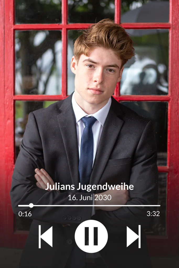 Lade mit dieser flippigen Einladungskarte zur Jugendweihe ein. Platziere vollflächig ein Foto deines Kindes und füge den Tag der Feier hinzu. Auf den weiteren Seiten findest du ausreichend Platz für nähere Informationen zum besonderen Tag.