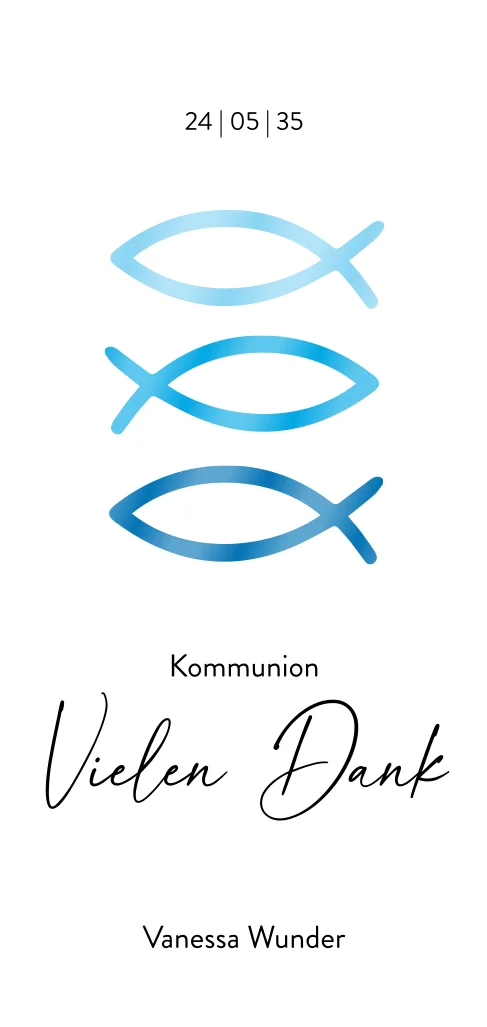 Diese Dankeskarte mit 3 Fischen ist wunderbar um sich bei allen Gästen für die Anwesenheit zu bedanken. Schreibe oben das Datum deines besonderen Tages und ganz unten deinen Namen auf der Frontseite. Auf den weiteren Seiten kannst du noch einen persönlichen Text verfassen.