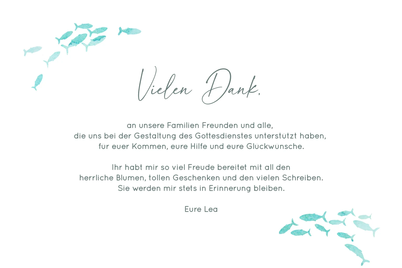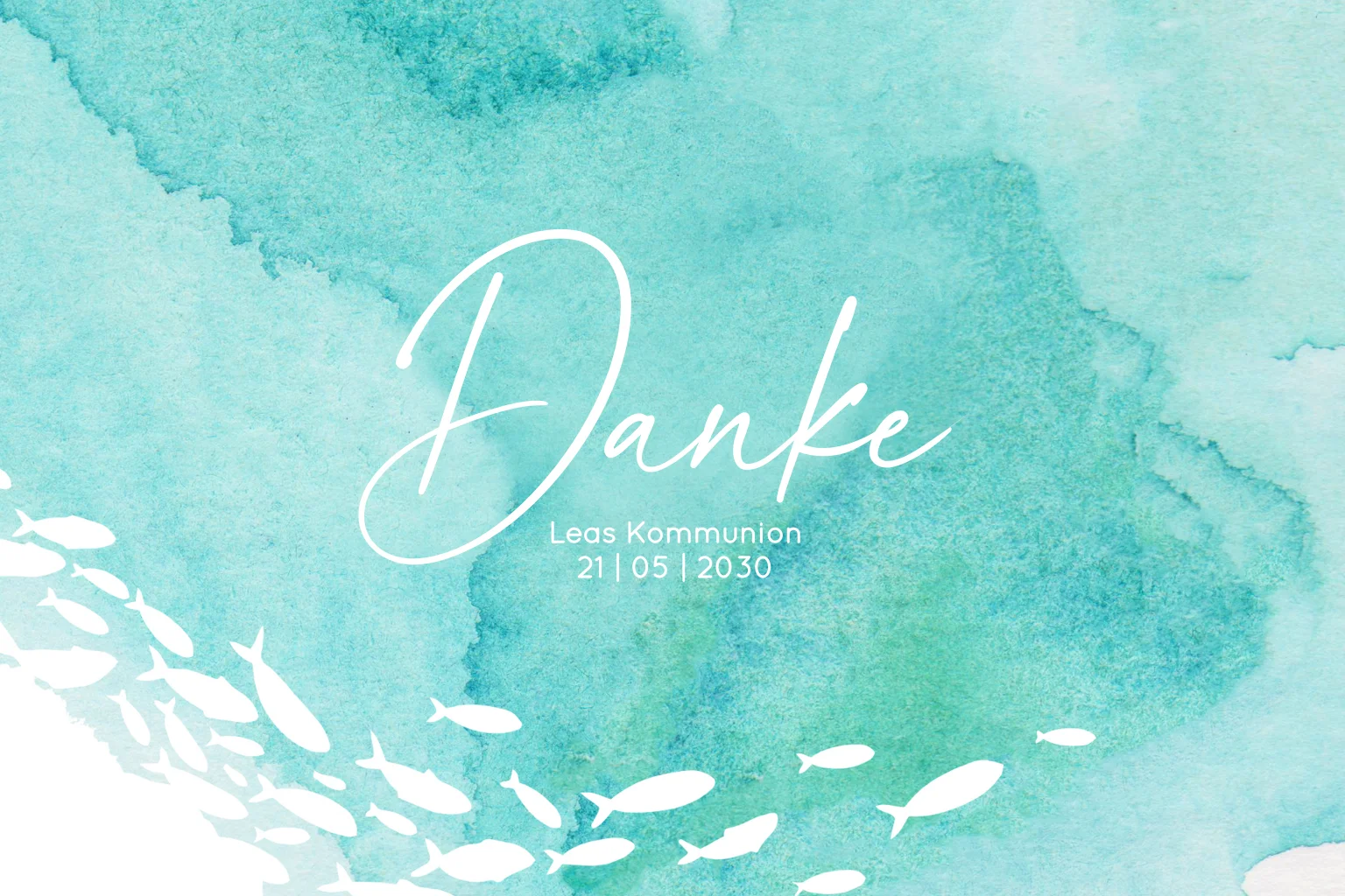 Dein großer Tag hatte eine tolle Dynamik. Es ist Zeit Danke zu sagen. Bedanke dich mit dieser Fischschwarm Dankeskarte auf grün-türkisem Aquarell für die Wünsche und Geschenke zu deiner Kommunion und genieße deinen neuen Meilenstein.