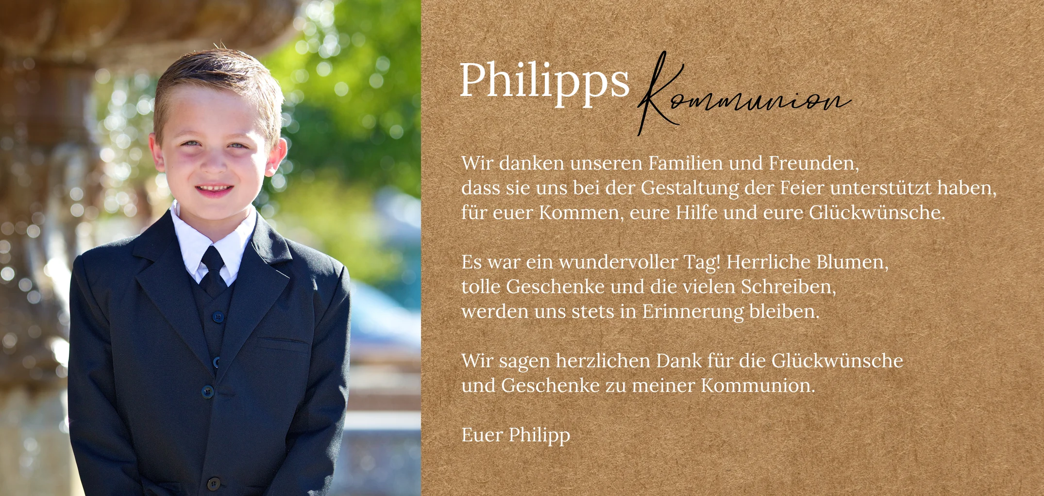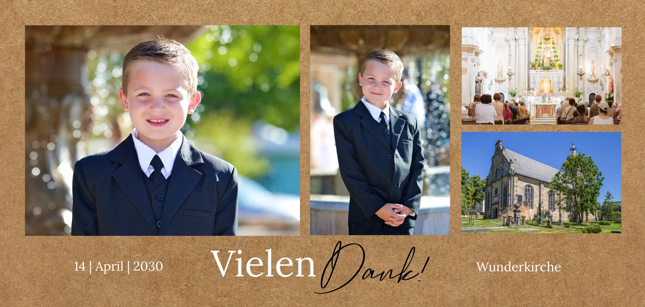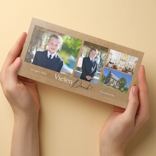 Deine Lieblingsfotos deiner Kommunion auf Kraftpapieroptik bilden die perfekte Momentaufnahme, um deinen großen Tag bei deinen Gästen in Erinnerung zu rufen. Bedanke dich für die Wünsche, zahlreichen Geschenke und den unvergesslichen Tag.
