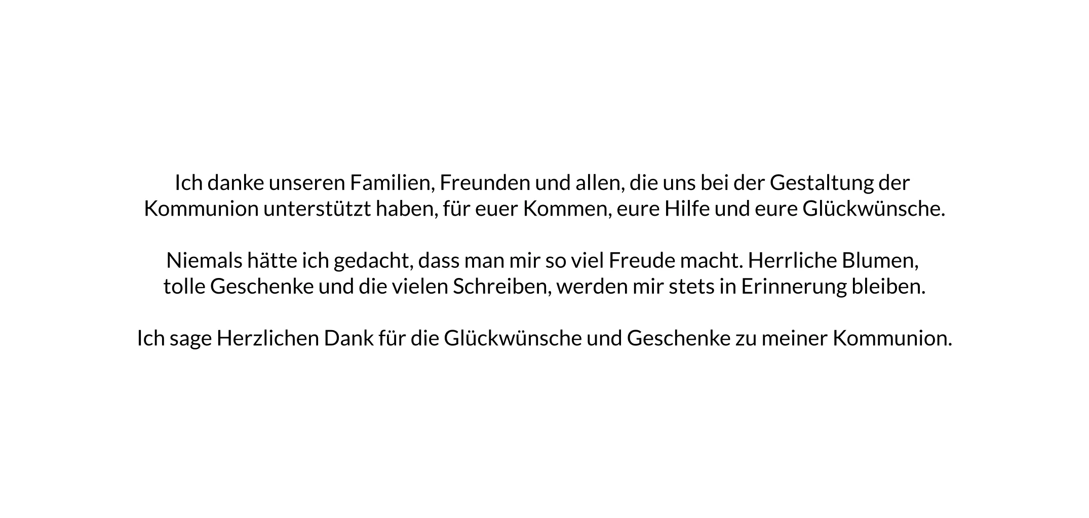 Simply lovely - einfach schön. Bedanke dich mit dieser ansprechenden Dankeskarte und deinen Lieblingsfotos und dem geschwungenen Schriftzug Vielen Dank, verbunden durch ein Herz, in eine unserer Textveredelungen für deine Kommunion.