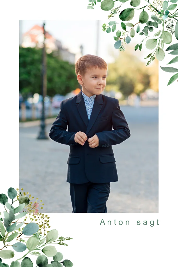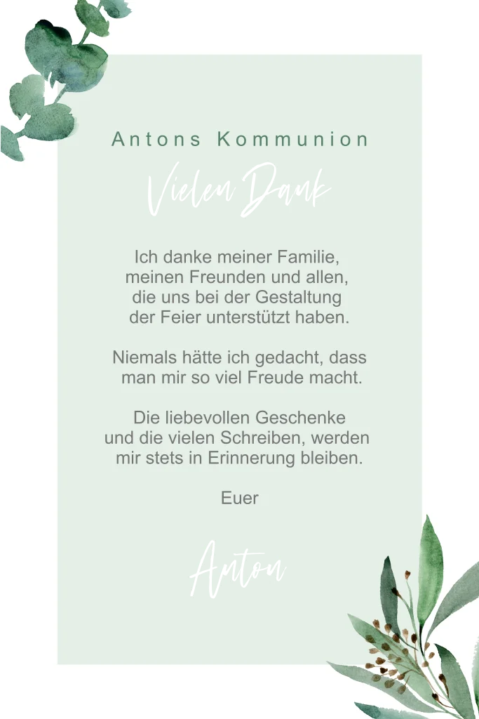 Sage stilvoll Danke mit dieser Dankeskarte zur Kommunion im natürlichen soft greenery Design. Natürliches Blattwerk im Eukalyptusstil umrahmt den Lieblingsmoment deiner Feier. Veredle den Dankesschriftzug und deinen Namen mit eine unserer Textveredelungen.