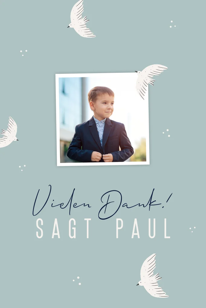Stilvolle Dankeskarte zur Kommunion mit Tauben und Foto. Passe das Design in unserem Editor an.