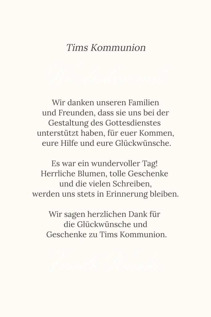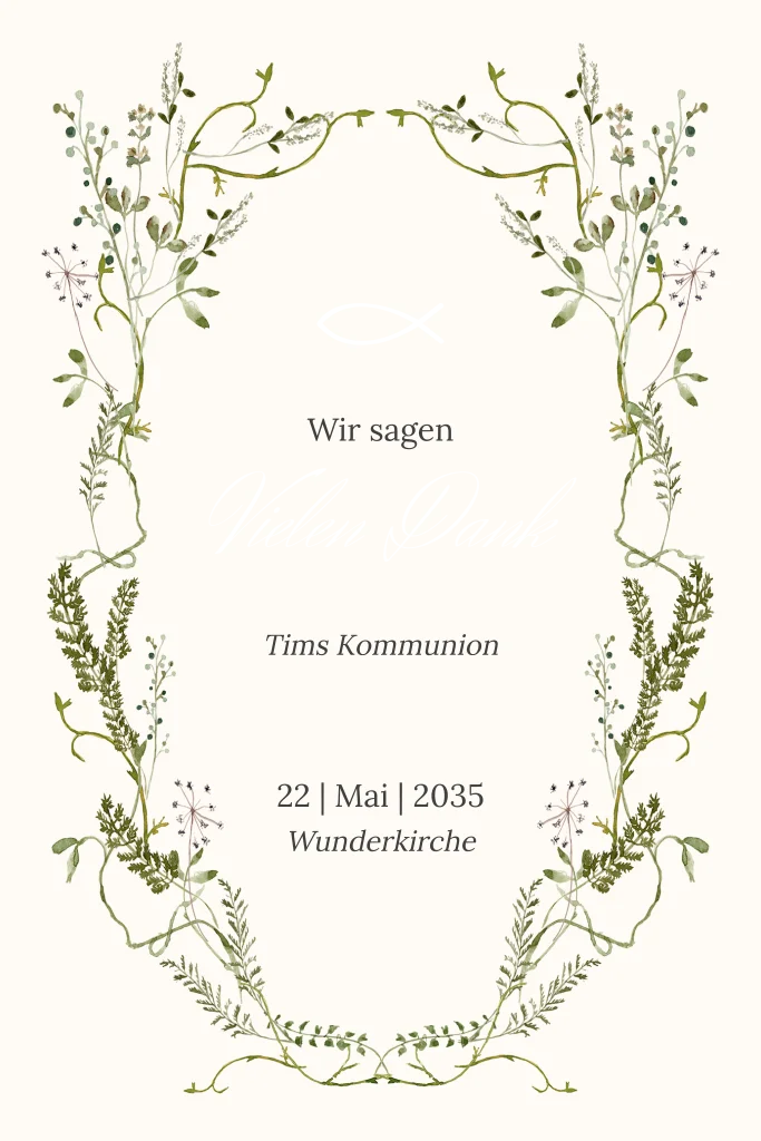 Das botanische zarte Grün auf dem beigen Hintergrund umrankt zart dein Dankeschön für deine Kommunion. Wähle für das Ichthys und den Dankesschriftzug eine unserer Textveredelungen für einen schicken Abschluss deines Meilensteins.