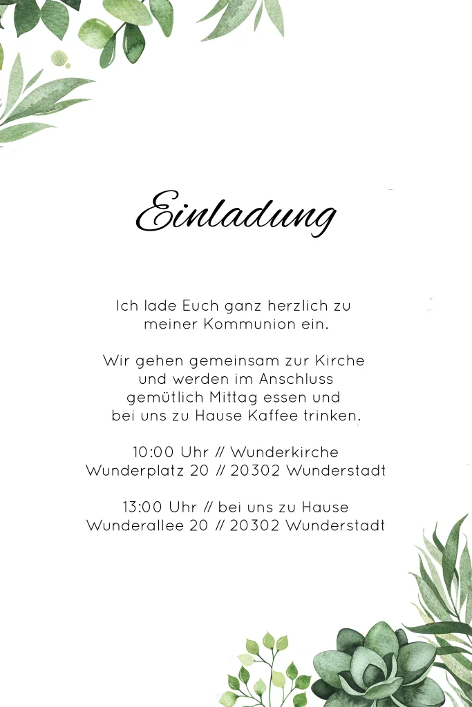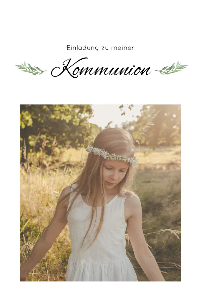 Eine tolle Einladungskarte zu deiner Kommunion, floral und stilvoll. Die grünen Pflanzenillustrationen verleihen deiner Einladung Leichtigkeit und symbolisieren den Übergang in deine neue Lebensphase. Wähle deine Lieblingsfotos für die Vorderseite und innen aus.