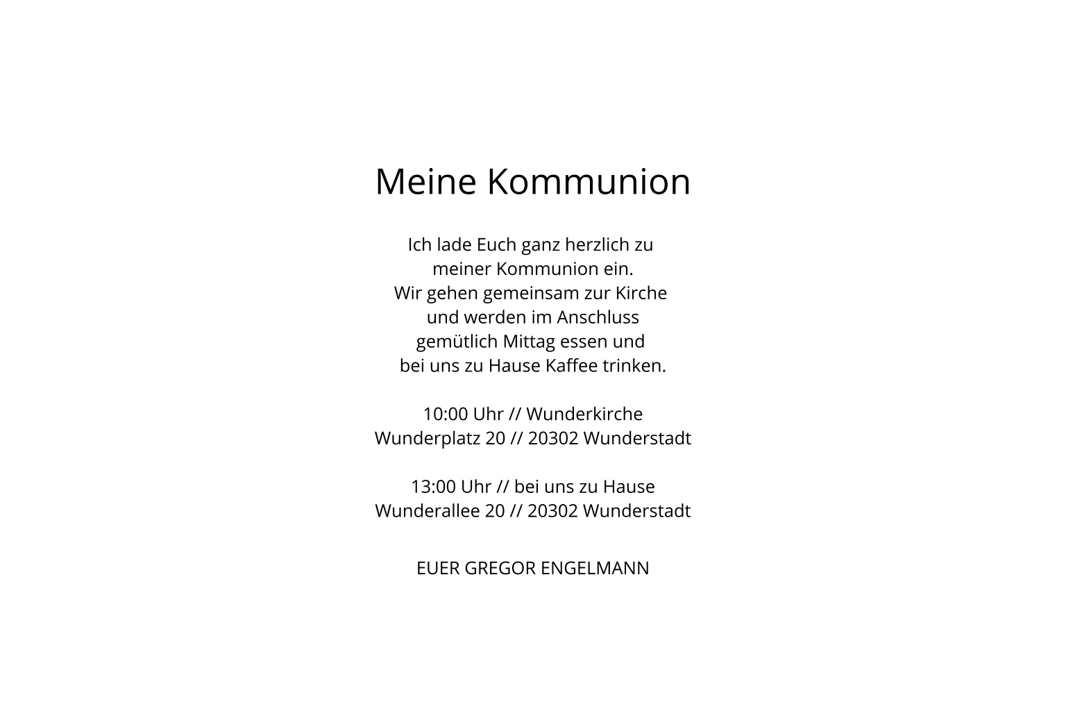 Ein tolles Foto von dir und schon vervollständigt sich die Fotoschrift Einladung zu meiner Kommunion auf der Kartenvorderseite. Innen kannst du das Foto noch einmal platzieren, damit es alle Gäste in Gänze bestaunen können und kündige deinen großen Tag an.