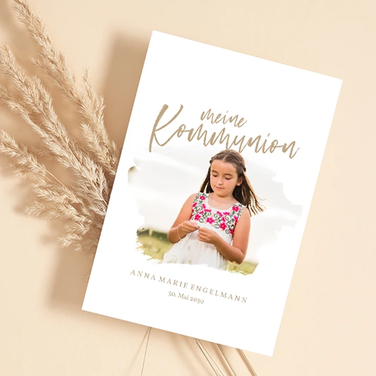 Wage den Blick durch das Aquarellfenster und rufe mit dieser einzigartigen Kommunionseinladung herbei. Freue dich auf eine tolle Kommunionsfeier mit deinen Gästen auf dem Weg zum neuen Meilenstein.