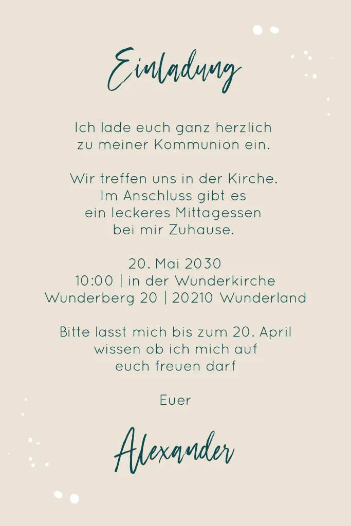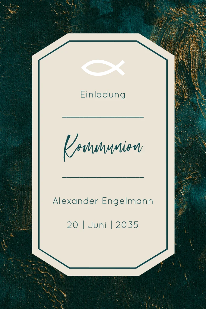 Schick zurechtgemacht wirst du an deiner Kommunion deinen neuen Meilenstein begehen. Grüner Marmor gepaart mit goldenen Anstrich-Applikationen vermitteln eine elegante Einladung, die deine Gäste sofort zusagen lassen.
