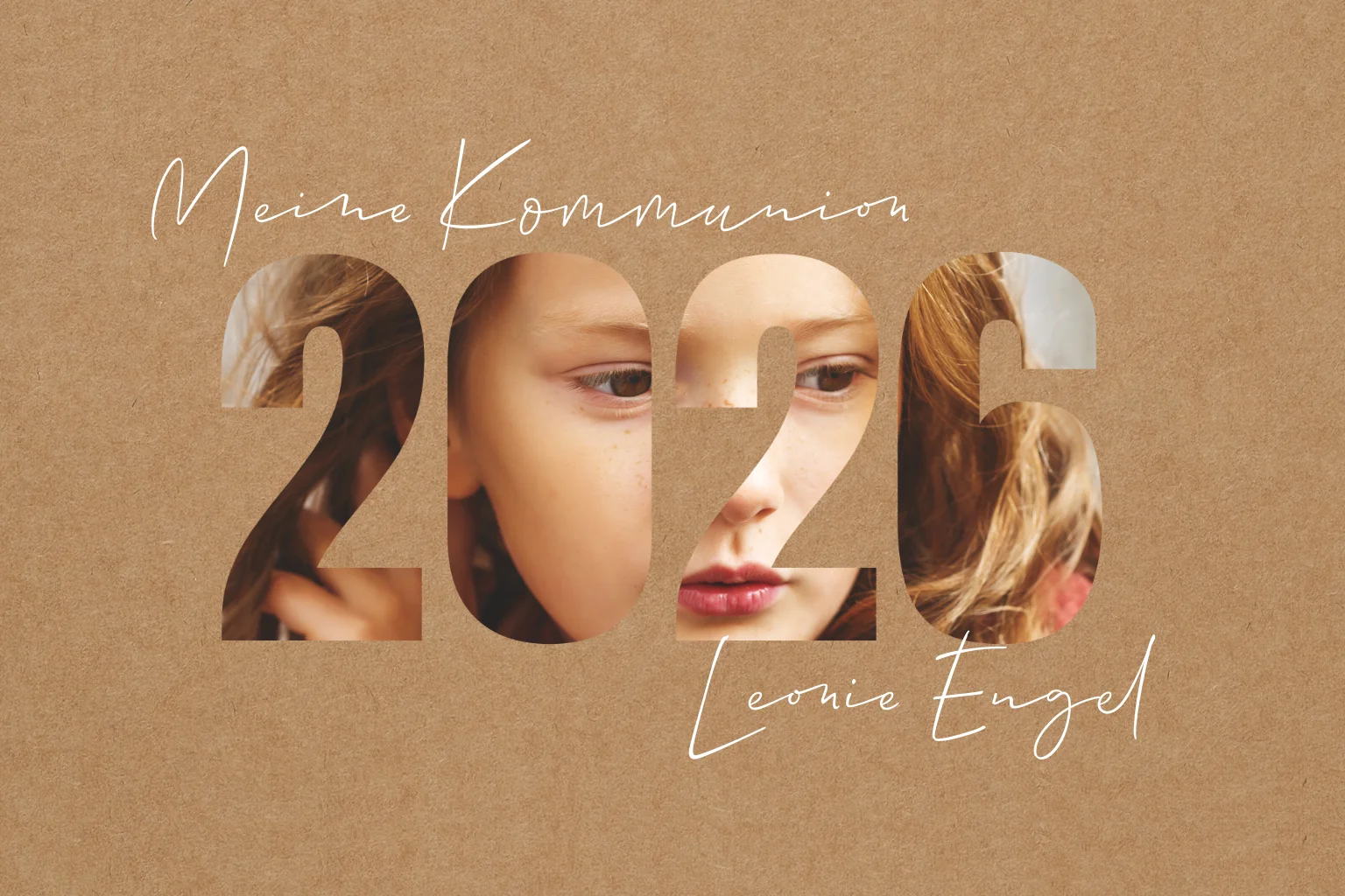 Ein aufregender Tag in deinem Leben steht bevor. 2026 - dein Kommunionsjahr. Füge ein tolles Foto von dir in die Jahreszahl auf der Vorderseite ein und übermittle schlicht und modern deine Einladung mit einem Hintergrund in Kraftpapieroptik.