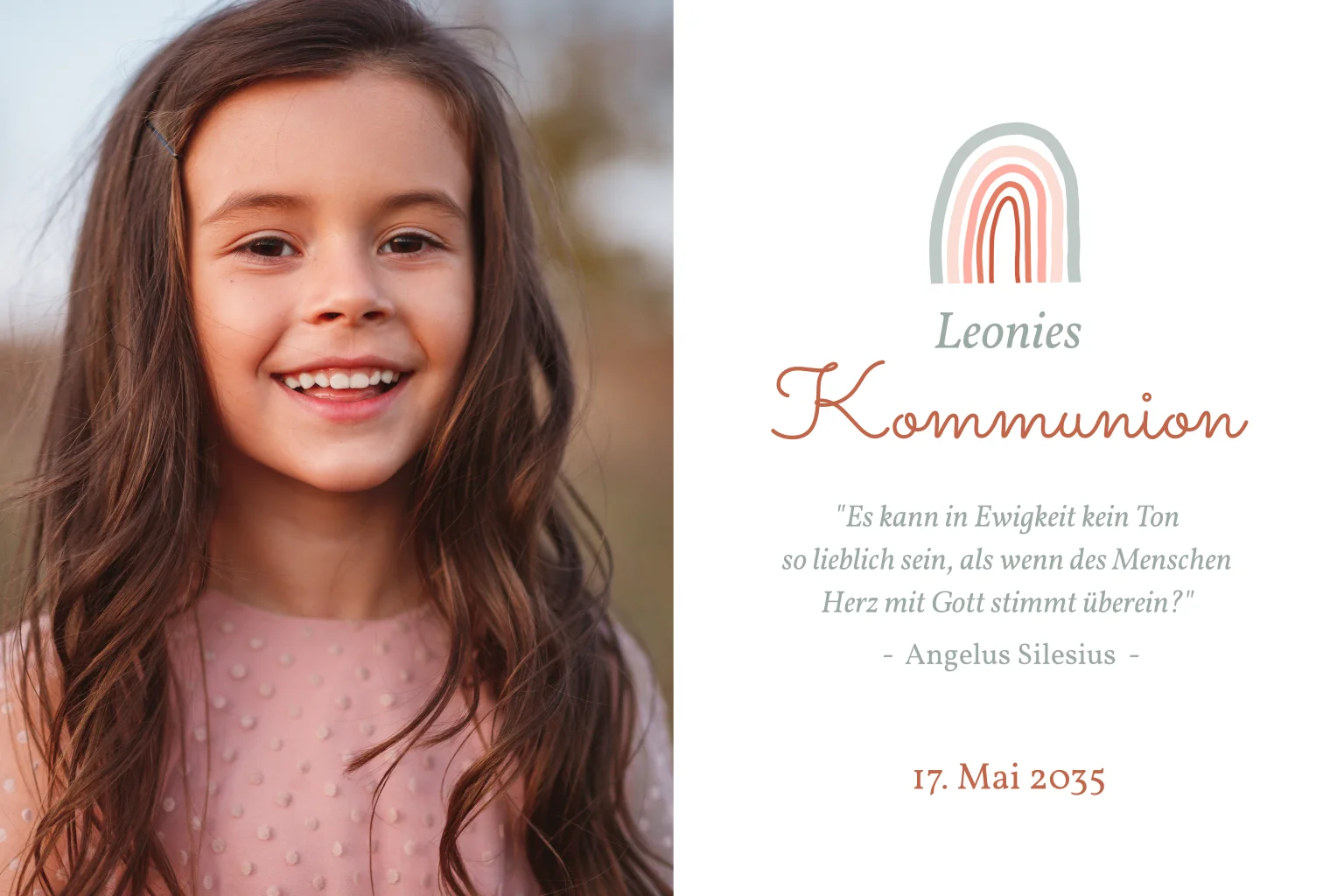 Deine Kommunion so bunt wie ein Regenbogen, das Symbol für Hoffnung und Verbindung. Kündige mit dieser persönlichen Kommunionskarte Sanfter Regenbogen mit deinem Lieblingsfoto deinen großen Tag an und verbinde dich mit deinen Gästen.