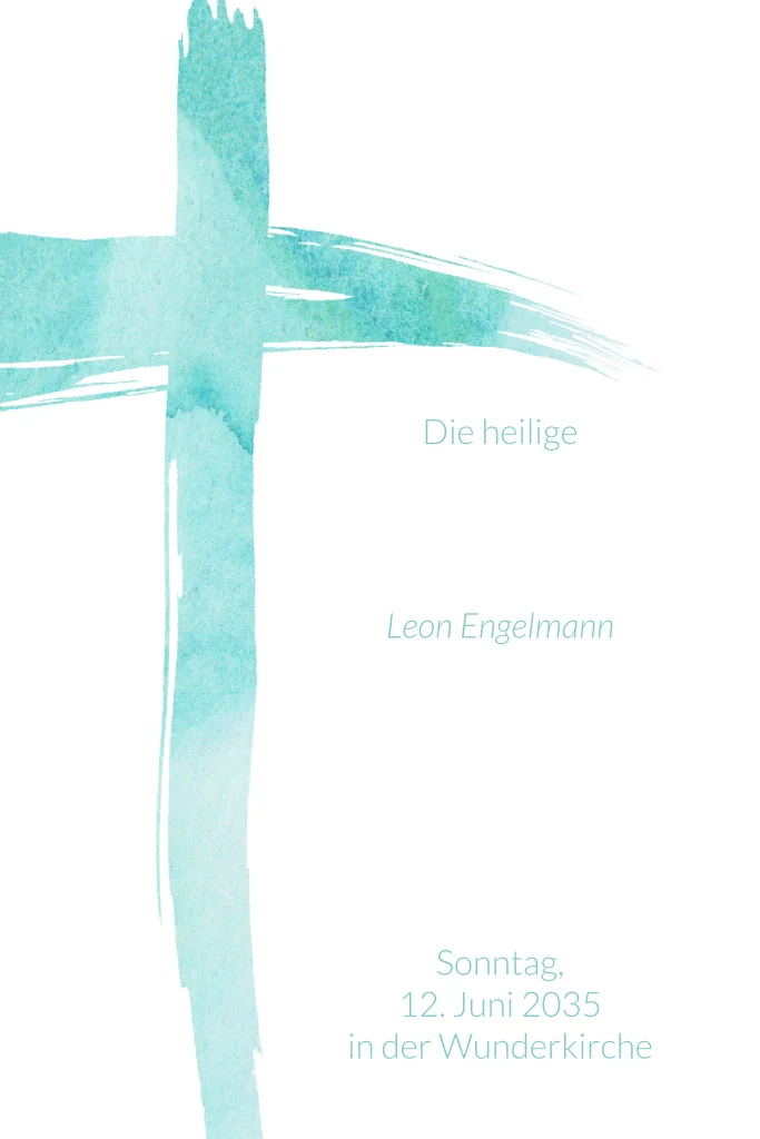 Gestalte diese stylische Karte zu deiner Kommunion und lade deine Familie und Freunde ein. Das große Kreuz in türkiser Wasserfarbe passt perfekt zu deinem großen Tag. Auf die Innenseite ist ausreichend Platz um nähere Informationen zu deiner Feier zu schreiben.