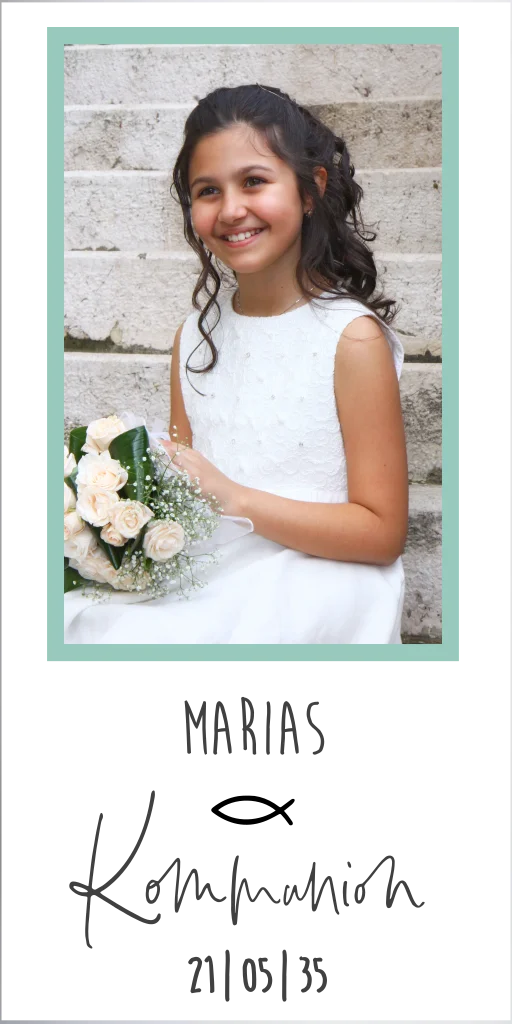 Diese wunderschöne Kerze kannst du mit einem Bild deines Kindes verzieren. Das Bild ist mit einem grünen Rahmen umrandet. Darunter schreibst du den Namen deines Kindes und das Datum des besonderen Tages. Die Kerze schmückt somit perfekt die Kaffeetafel bei deiner Kommunionsfeier.
