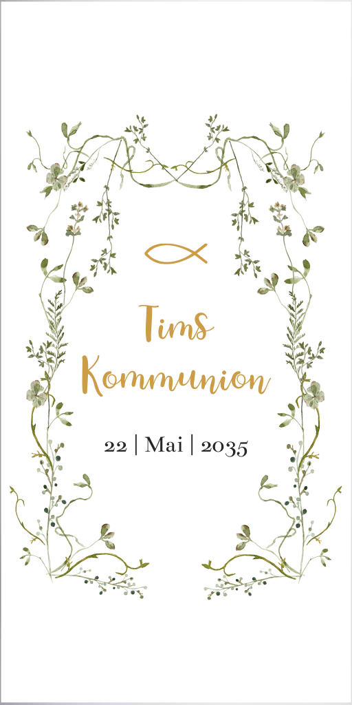 Die Kerze mit grünen, zarten Blätterranken ist im floralen Design und passt somit vielleicht perfekt zu deiner Tischdeko bei der Feier der Kommunion. Gestalte die Kerze mit dem Namen deines Kindes und das Datum des großen Tages.
