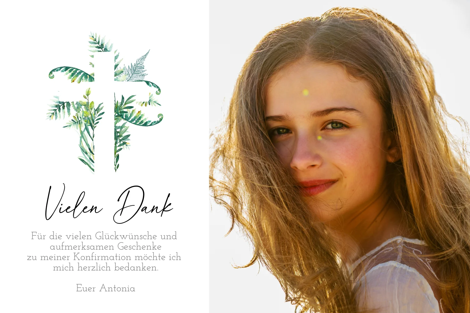 Dein Lieblingsfoto deiner Konfirmation nebst dem botanischen Kreuz bilden eine tolle Verbindung. Bedanke dich aufrichtig für die vielen Glückwünsche und die aufmerksamen Geschenke an deinem großen Tag.