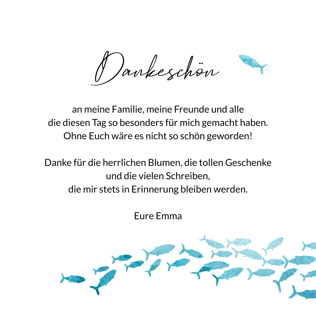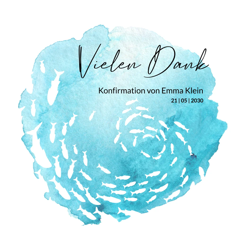 Dein großer Tag hatte eine tolle Dynamik. Es ist Zeit Danke zu sagen. Bedanke dich mit dieser Fischschwarm Dankeskarte auf türkisem Aquarell für die Wünsche und Geschenke zu deiner Konfirmation und genieße deinen neuen Meilenstein.