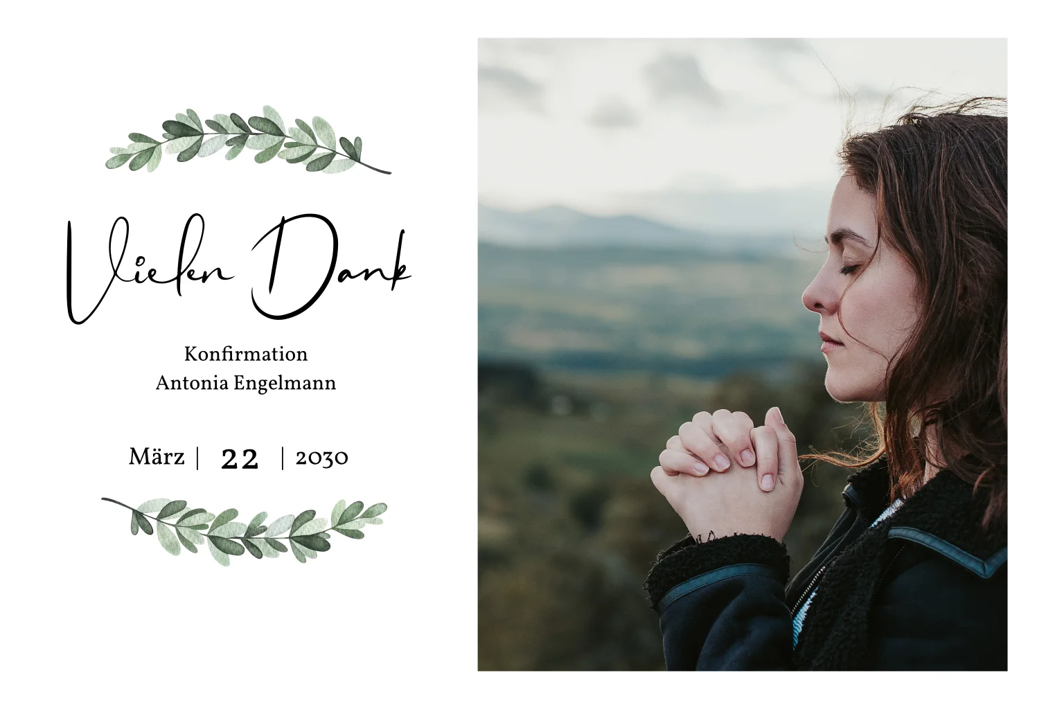 Ein florales Danke nach deiner Konfirmation mit dem Dankesschriftzug gekrönt von grünen Zweigillustrationen und einem Foto von deinem großen Tag. Rufe ihn bei deinen Gästen in Erinnerung und bedanke dich für die Gestaltung des Gottesdienstes und die zauberhaften Geschenke.