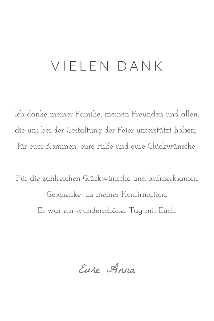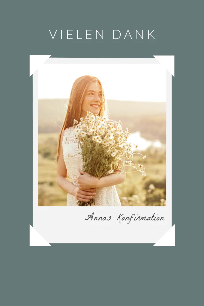 Den Mittelpunkt dieser Dankeskarte bildet ein Portraitfoto deiner Konfirmation in Form eines Polaroids. Bedanke dich für das Zusammenkommen an deinem großen Tag, die zahlreichen Glückwünsche und die tolle Feier.