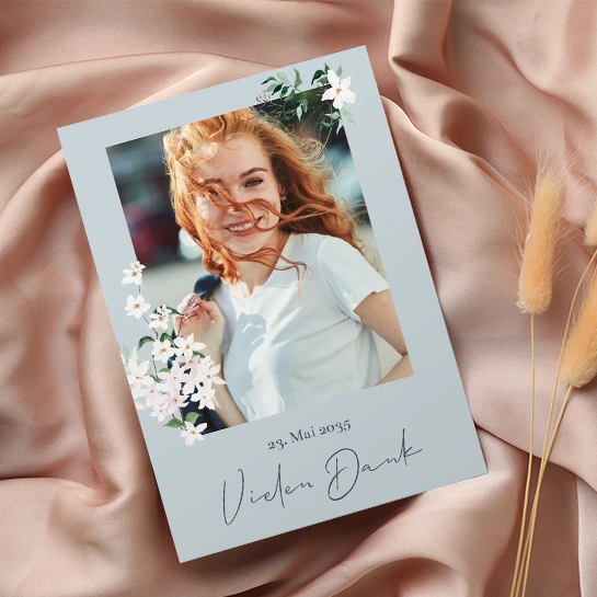 Blumig und dezent - diese Karte hat eine grauen Hintergrund und ist mit kleinen Blumen verziert. Platziere ein schönes Bild deines Kindes und bedankt euch somit bei euren lieben Gästen für diesen besonderen Tag.