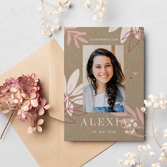 Eine schöne Einladungskarte zu deiner Konfirmation. Dein Lieblingsfoto auf Kraftpapieroptik umschmeichelt von kleinen rosanen Herzchen und rosanen Zweigen. Verzaubere deine Liebsten und freue dich auf deinen Meilenstein mit einer großartigen Feier.