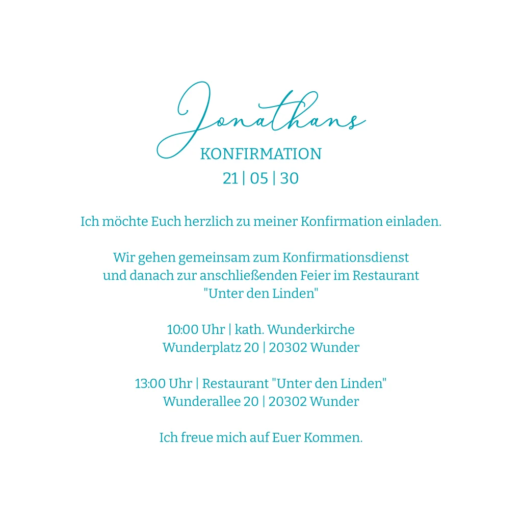 Eine Aquarell-Einladungskarte zur Konfirmation ist ein liebevoll gestaltetes Element, das den besonderen Anlass auf einzigartige Weise unterstreicht. Die Verwendung von Aquarellfarben verleiht der Karte eine sanfte, künstlerische Note und schafft eine einladende Atmosphäre.