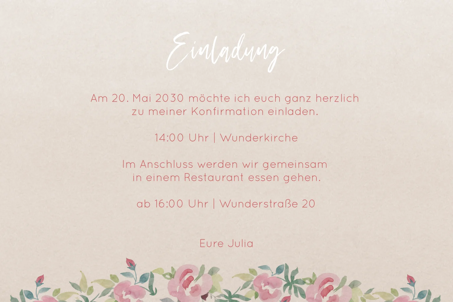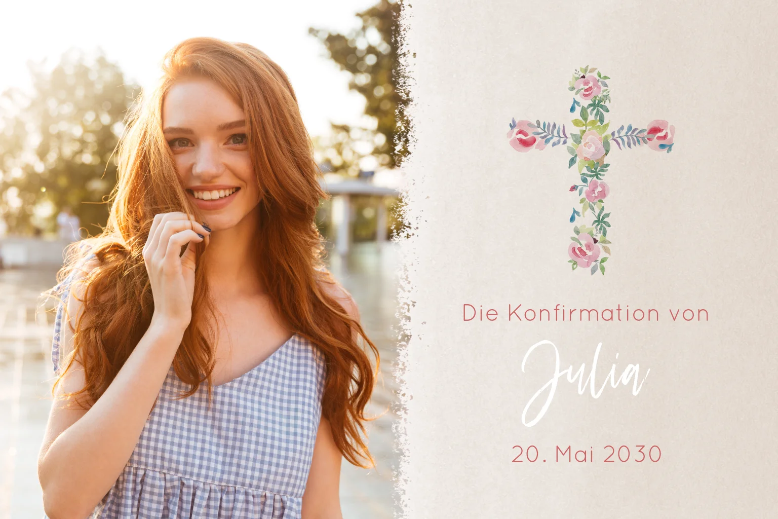 Eine elegante Einladungskarte für deine Konfirmation mit Blumen im Kreuz, die sich in der Innenseite und auf der Rückseite wiederfinden auf einer hellen Kraftpapieroptik. Kombiniert mit deinem Lieblingsfoto lade deine Gäste zu deinem besonderen Tag ein.