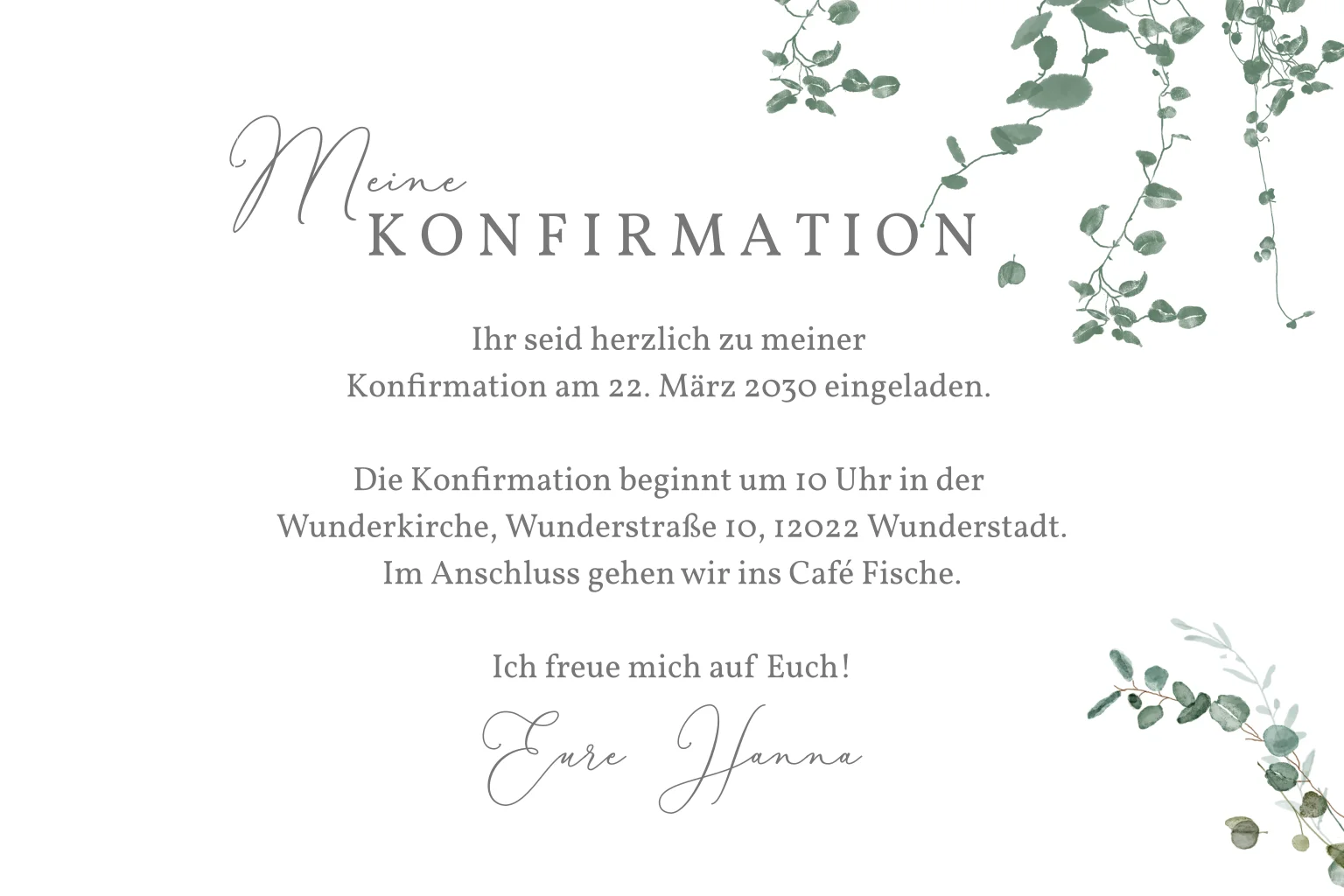 Auf dem Weg zum Erwachsenwerden sind der zarte Eukalyptus und die feinen Goldakzente die perfekte Mischung, um elegant zu deiner Konfirmation einzuladen. Überrasche deine Gäste mit deinem Lieblingsfoto in der Innenseite.