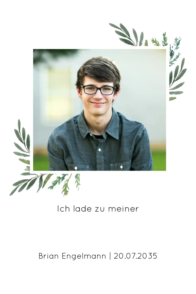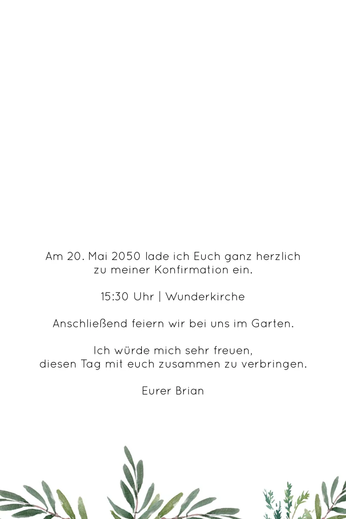 Modern und schlicht wird dein Foto auf der Vorderseite von unserem Blattdesign in Szene gesetzt. Wage einen Ausblick aus dem Greenery Fenster und freue dich auf eine tolle Konfirmationsfeier mit deinen Gästen auf dem Weg zum Erwachsenwerden.