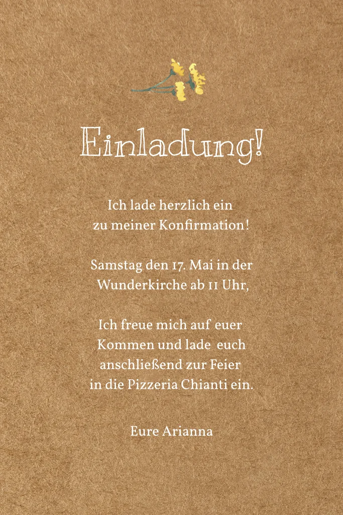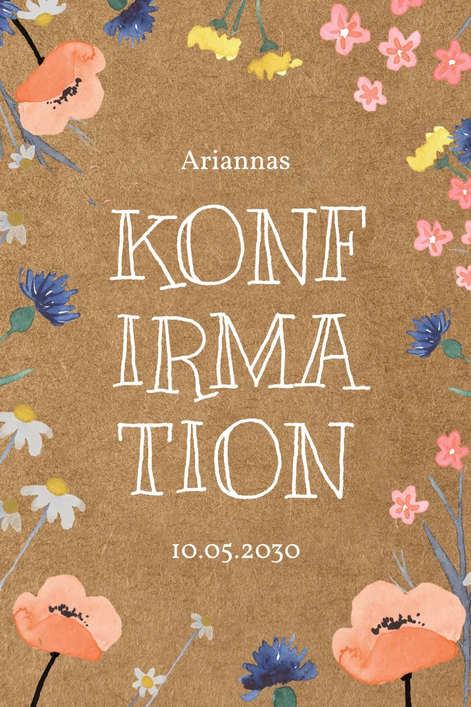 Umrahmt von frühlingshaften Blumen in bunten Farben, symbolisiert die Einladung die Freude und den Neuanfang, die dieser besondere Tag zur Konfirmation mit sich bringt. Ladet eure Gäste mit dieser blumigen Karte ein.