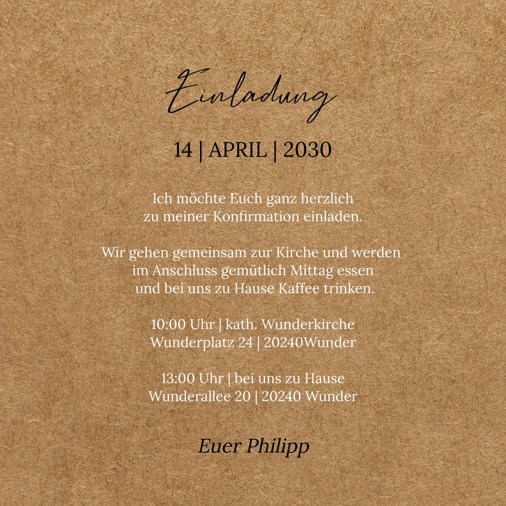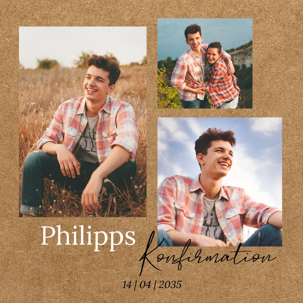 Deine Lieblingsfotos als Momentaufnahme auf Kraftpapieroptik. Lade deine Gäste zu deiner einzigartigen Konfirmationsfeier ein, um einen weiteren besonderen Moment in deinem Leben zu schaffen, den Wendepunkt zum Erwachsenwerden.