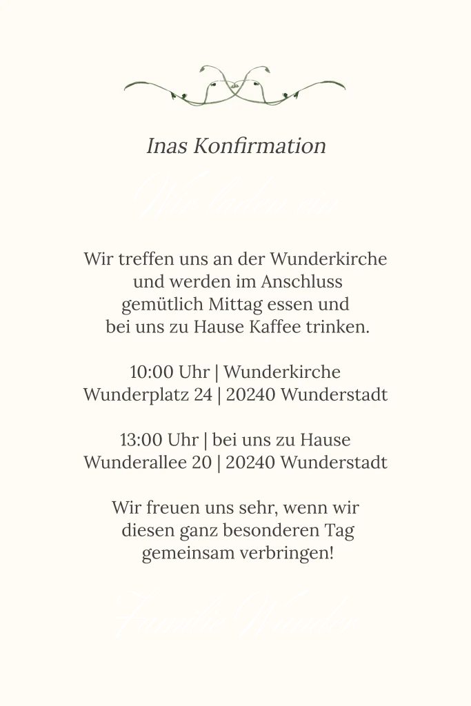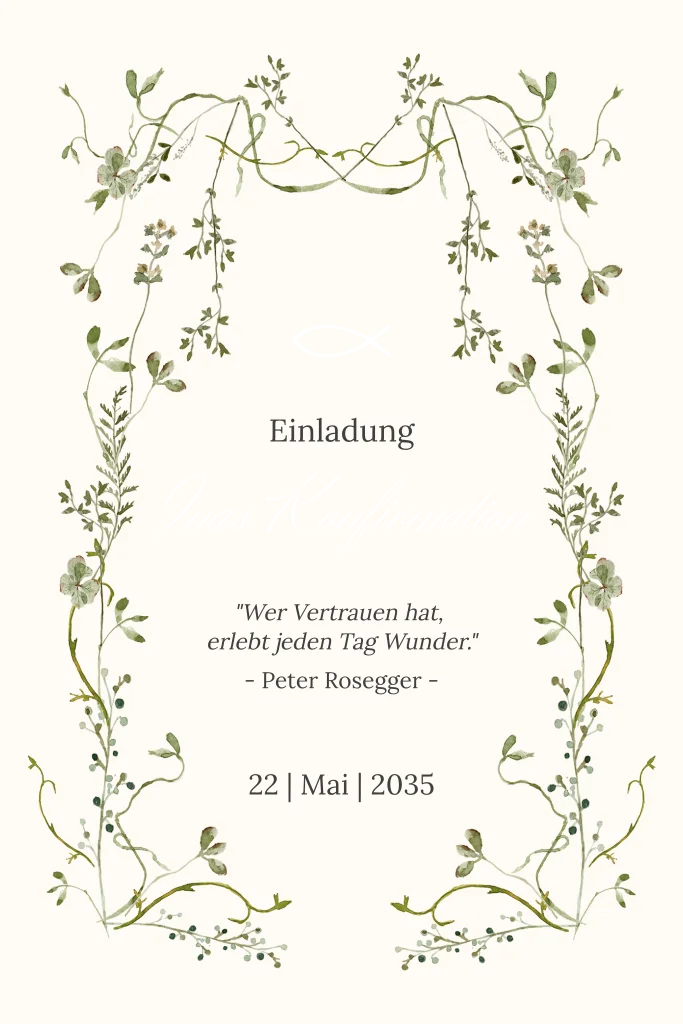 Die botanische Einladungskarte zur Konfirmation mit zartem Grün auf beigen Hintergrund umrankt die wichtigsten Informationen für deine Gäste auf der Vorderseite. Wähle für das Ichthys und den Konfirmationsschriftzug eine unserer Textveredelungen für einen schicken Auftritt.