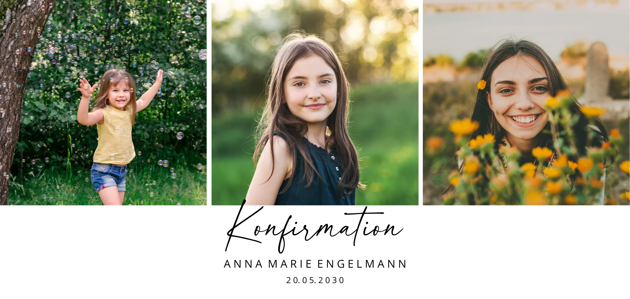 Wie die Zeit vergeht. Auf dem Weg zum Erwachsenwerden gewährt diese Einladungskarte zur Konfirmation auf der Vorderseite einen Einblick in die Meilensteine deiner Kindheit. Entzücke deine Gäste mit der Bilderreihe und freue dich auf einen spannenden neuen Wendepunkt.