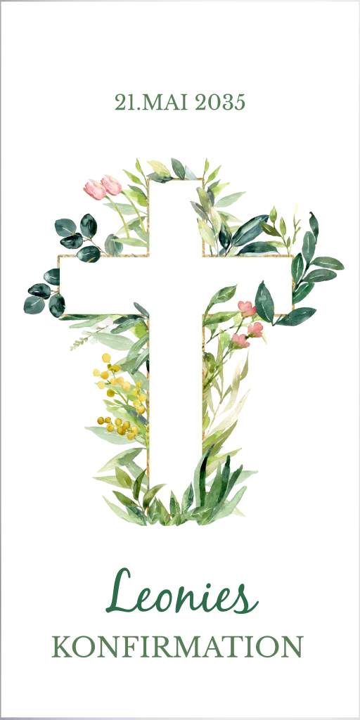 Zu einem besonderen Anlass kann man auch gern mal eine besondere Kerze verschenken. Diese Kerze für die Konfirmation ist mit einem Blumenkreuz verziert. Vervollständige die Kerze mit deinen Daten zur Feier.