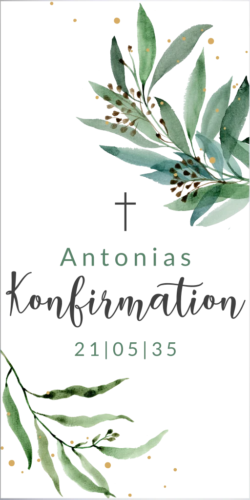 Runde die Feierlichkeit der Konfirmation mit dieser wunderschönen Kerze ab. Das Licht zur Konfirmation ist besonders und signalisiert den Beginn eines neuen Lebensabschnittes. Das Design mit grünen Blättern ist dezent. In der Mitte hast du Platz für den Namen deines Kindes und das Datum der Konfirmation.