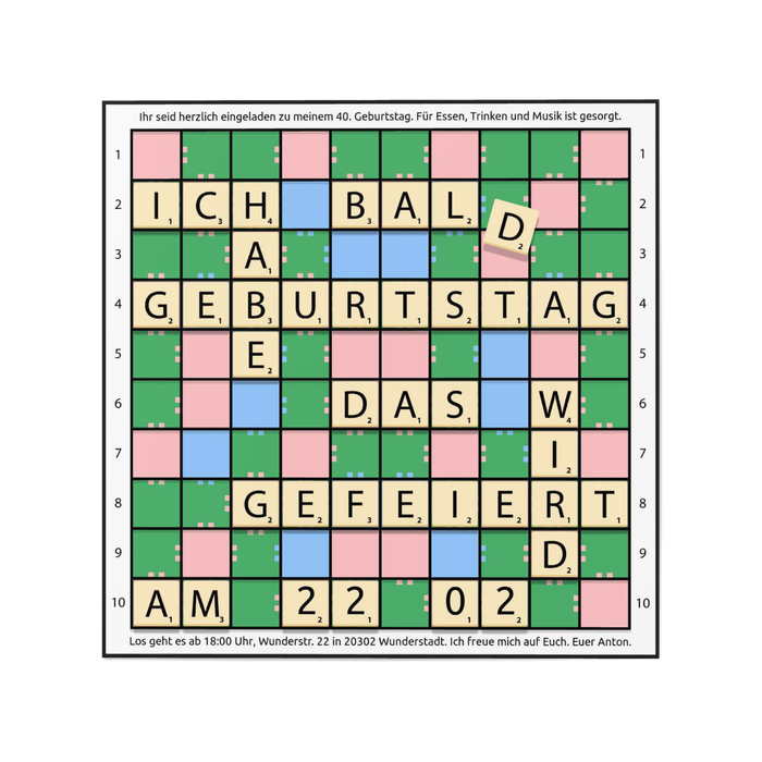 Einladungskarte 40. Geburtstag Scrabble