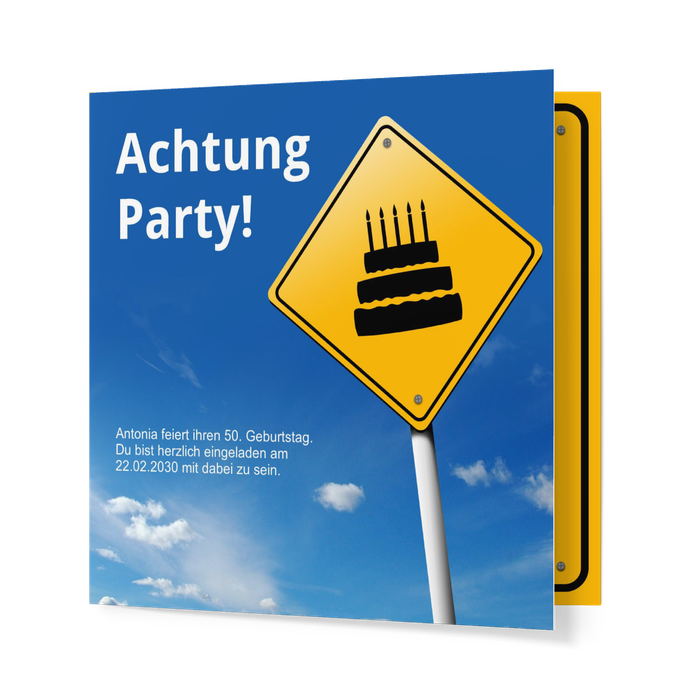 Achtung! Diese Party wird lustig. Und genau unter diesem Stern steht unsere neueste Karte . Das Schild, welches vor einer großen Torte warnt, bringt charmanten Witz in jede Einladung zu Ihrer Geburtstagsparty und lässt Ihre Gästre schon vorab schmunzeln.