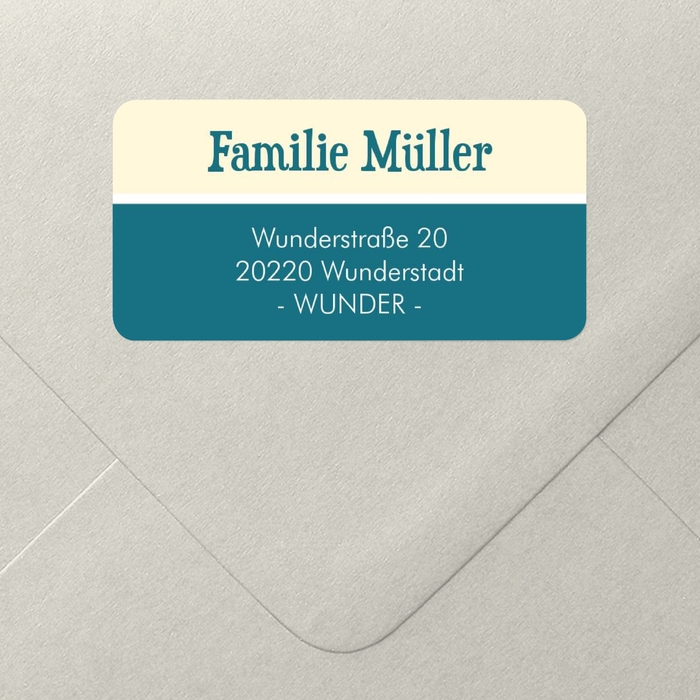Zwei Farben sind die Grundtöne dieses Adressaufklebers: Ein heller Cremeton und ein kräftiges Türkis. Tragen Sie hier Ihren Namen und Ihre Adresse ein und gehen Sie so sicher, dass nichts mehr übersehen werden kann.