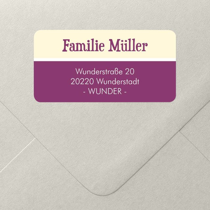 Ein fruchtiger Lilaton und ein heller, cremefarbener Streifen bestimmen das Erscheinungsbild dieses Adressaufklebers. Mit Ihrem Namen und Ihrer Anschrift wird er zu einem echten Hinweis auf den Absender, der sich harmonisch in das Erscheinungsbild des Umschlags eingliedert.