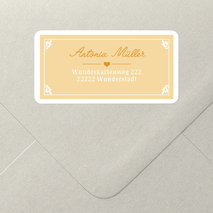 Ein Adressaufkleber mit Rahmen in Orange passend zu Ihrer Dankeskarte zur Hochzeit. Da bekanntlich viele Gäste auf der Hochzeit sind, werden auch viele Dankeskarten erstellt. Nutzen Sie unseren kreativen Adressaufkleber, um das Adressenschreiben zu vermeiden.