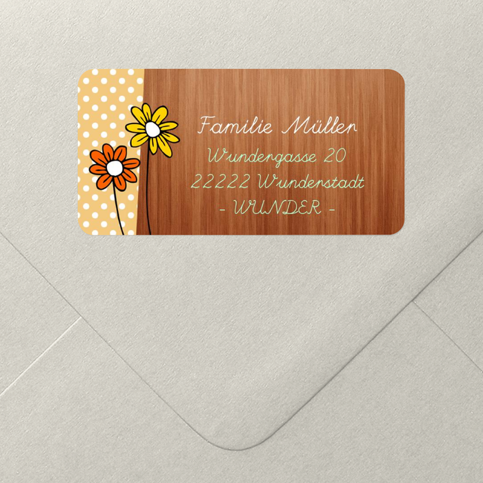 Sie möchten Ihre Post verschönern, damit jeder Empfänger weiß, von wem die tollen Nachrichten sind? Wählen Sie dieses niedliche Adressetikett mit Blümchen und fügen Sie Ihren Namen und Ihre aktuelle Anschrift ein. Die Kombination von Gelb, Orange und Holzfarbe verleiht dem Adressaufkleber ein Retro Look.