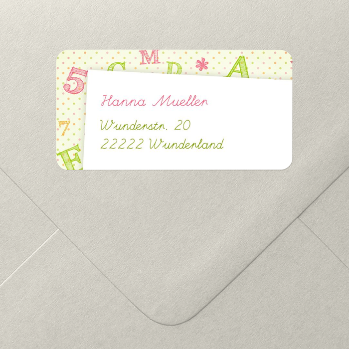 Der Adressaufkleber mit bunten Buchstaben auf einem kleinen Notizzettel, perfekt abgestimmt auf die dazugehörige Einschulungskarte.