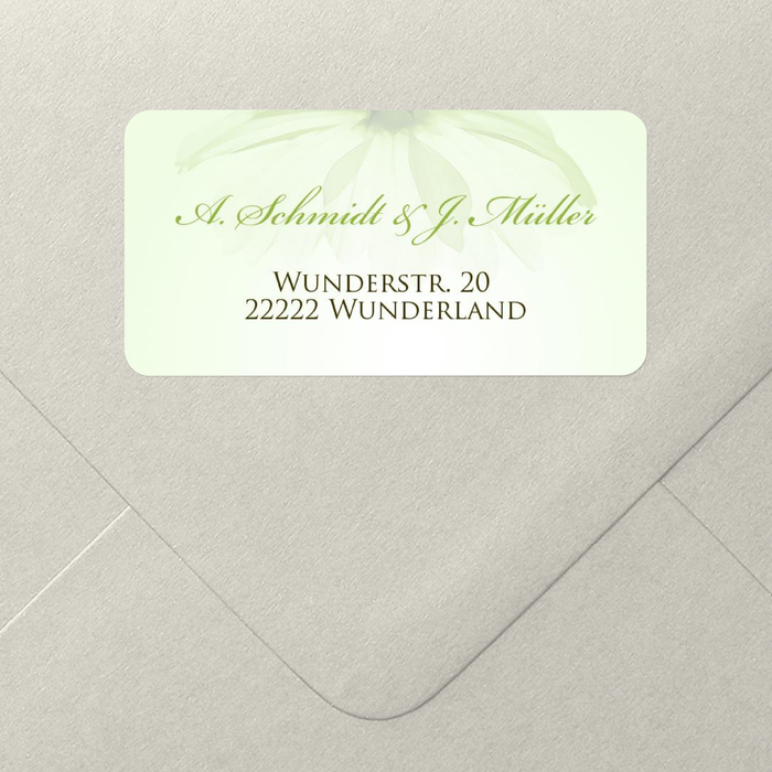 Der Adressaufkleber in zartem Grün verleiht Ihren Hochzeitseinladungen ganz besonderen Charme. Das Etikett verrät sofort, von dem die Einladung stammt.