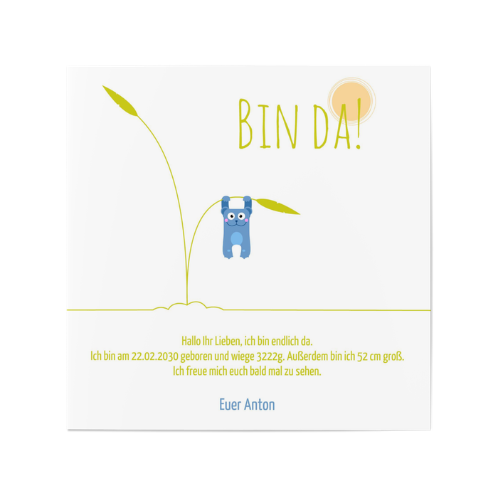 Zuckersüß der kleine Bär in blau! Genau das richtige Motiv, um Ihren kleinen Sohn der Welt zu präsentieren! Diese Babykarte ist die perfekte Ankündigung für einen Jungen. Teilen Sie Ihren Freunden und Bekannten die wichtigsten Details des Neuankömmlings mit!