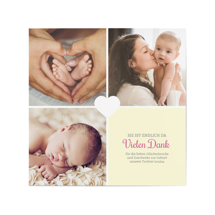 Diese stilvolle, crèmefarbene Dankeskarte zur Geburt erreicht die Empfänger mit einem kleinen Herzchen und vielen Platz für zuckersüße Bilder Ihres neuen, großen Glücks. Verschicken Sie die Dankeskarte an alle, die Sie vor, während und nach der Geburt unterstützt haben.