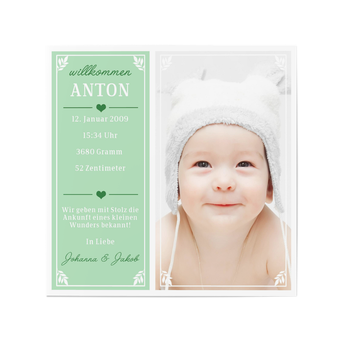 In einem frischen Grün kommt diese Fotoankündigung zur Geburt Ihres Babys zu Ihnen Nachhause. Ihre persönliche Botschaft an Ihre Freunde und Verwandte wird zusätzlich mit einem feinen weißen Rahmen verziert. Fügen Sie das erste Bild Ihres Babys hinzu und versenden Sie ein Lächeln.