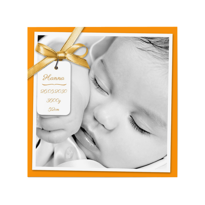 Diese fröhliche Baby Geburtsankündigung als Doppelklappkarte in Orange wird Ihre Familienmitglieder und Freunde entzücken. Das Namensschild mit einer kleinen orangenen Schleife eignet sich besonders gut, um auch weitere Angaben über ihren prachtvollen Nachwuchs zu machen. Ihre Freunde werden staunen!